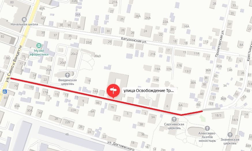 На улице Освобождения Труда находятся три церкви: Введенская, Сергиевская и Знаменская, а также Алексеево-Акатов монастырь.