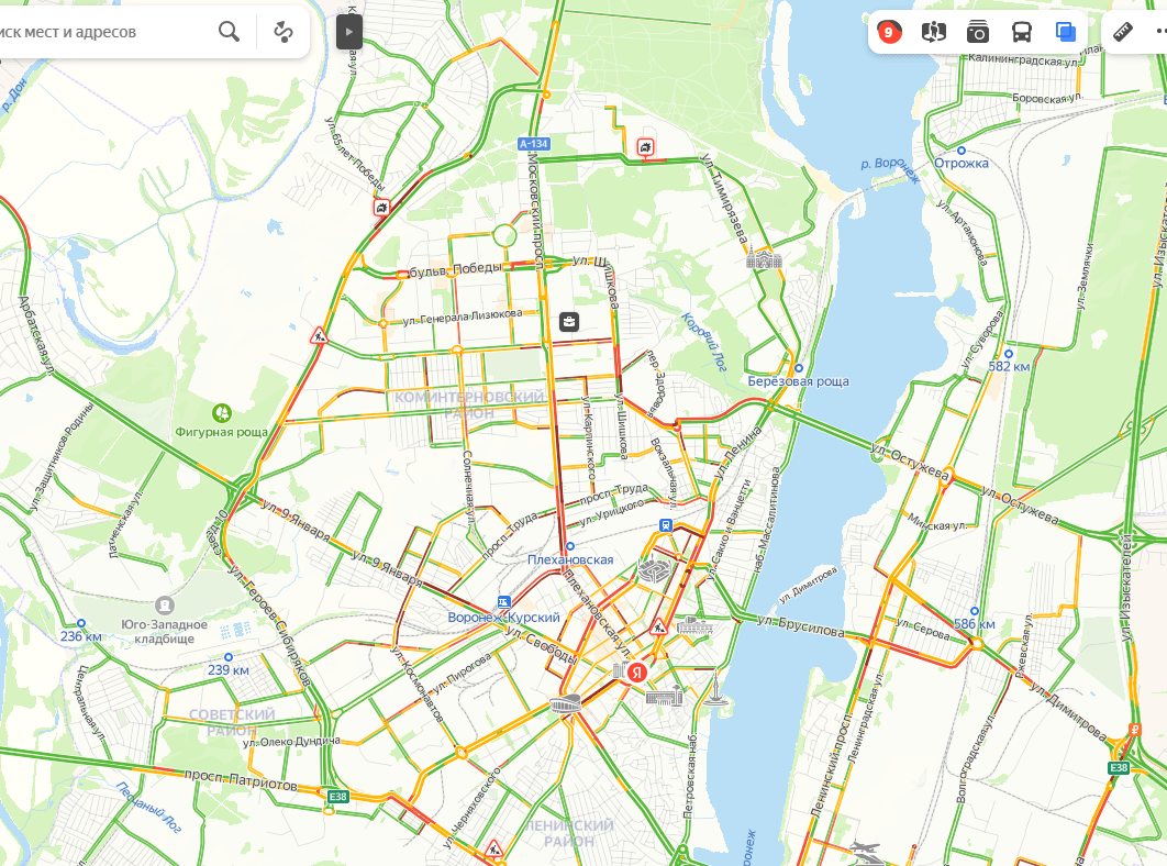 Девятибалльные пробки сковали Воронеж примерно в 18:20 сегодня, 4 марта. Об этом сообщает сервис «Яндекс. Пробки».