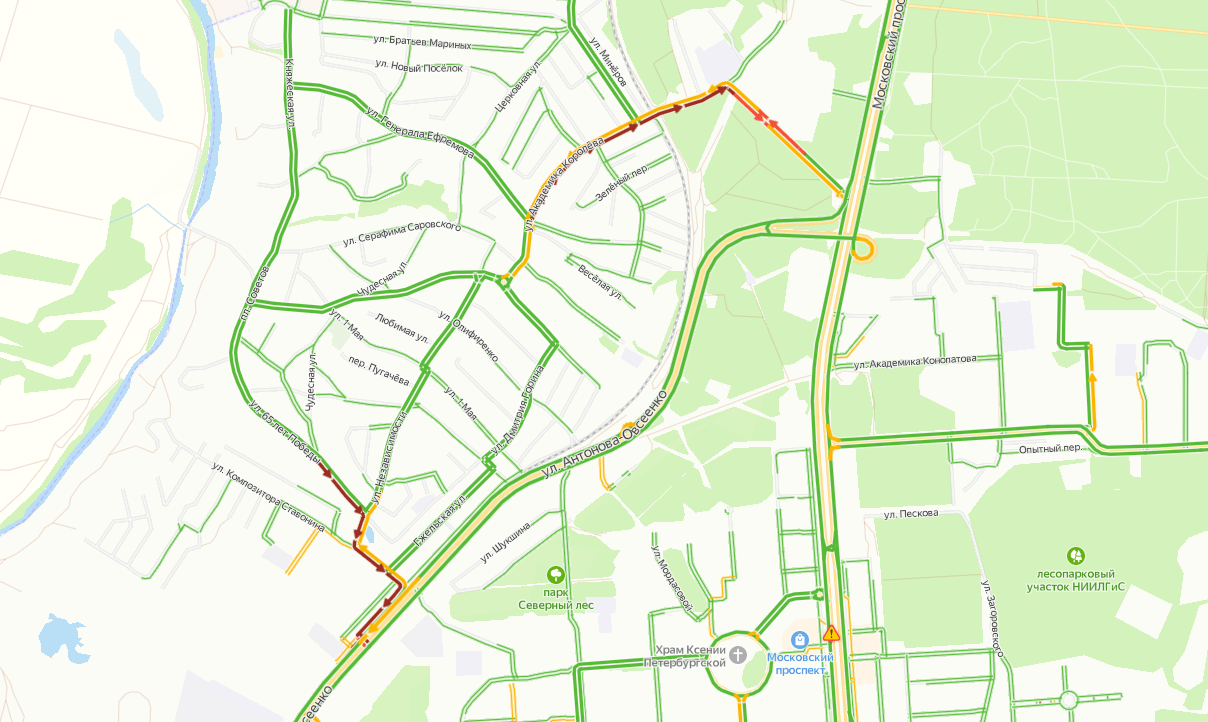 На «Яндекс.Картах» видно, что к 9:40 оба выезда из Подгорного всё ещё заблокированы.