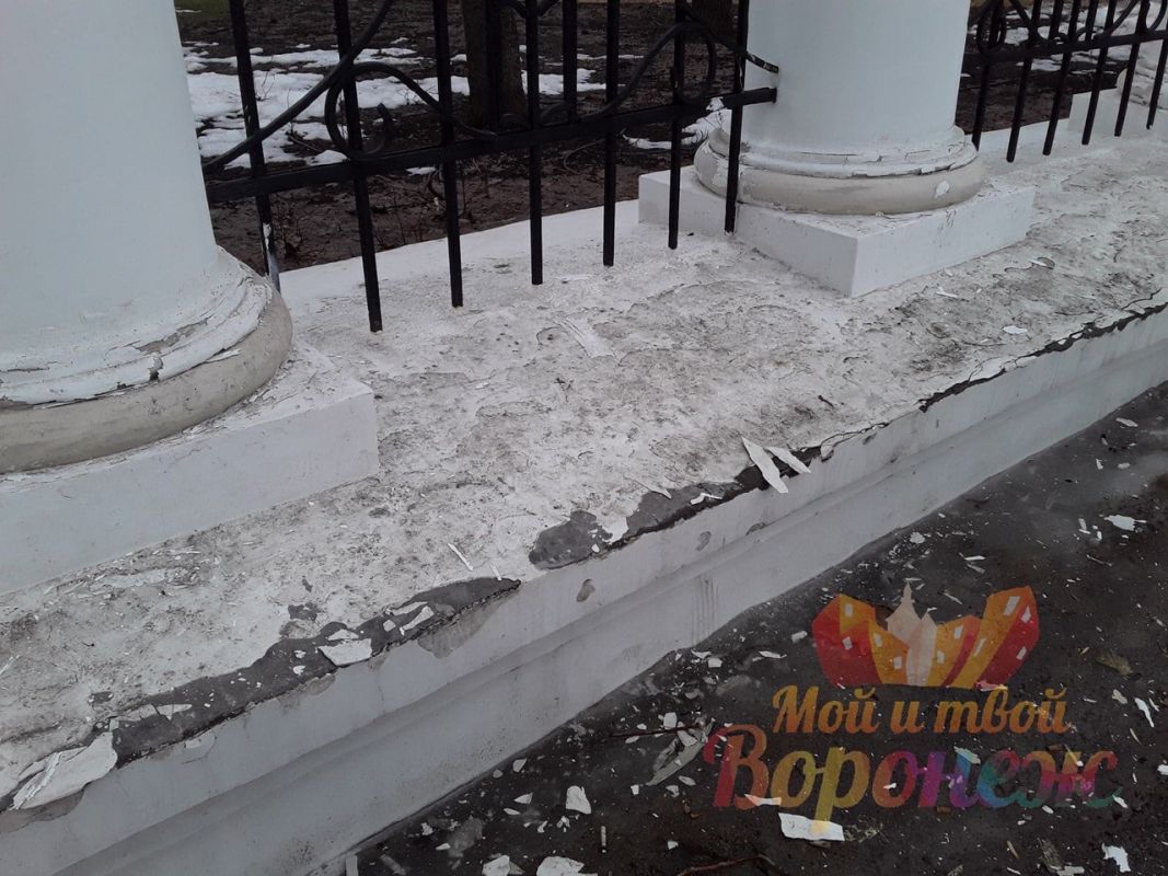 С основания входной группы воронежского парка «Орлёнок» осыпалась новая штукатурка. Фото дефектов в недавно обновлённом парке опубликовали в группе «Мой и твой Воронеж».