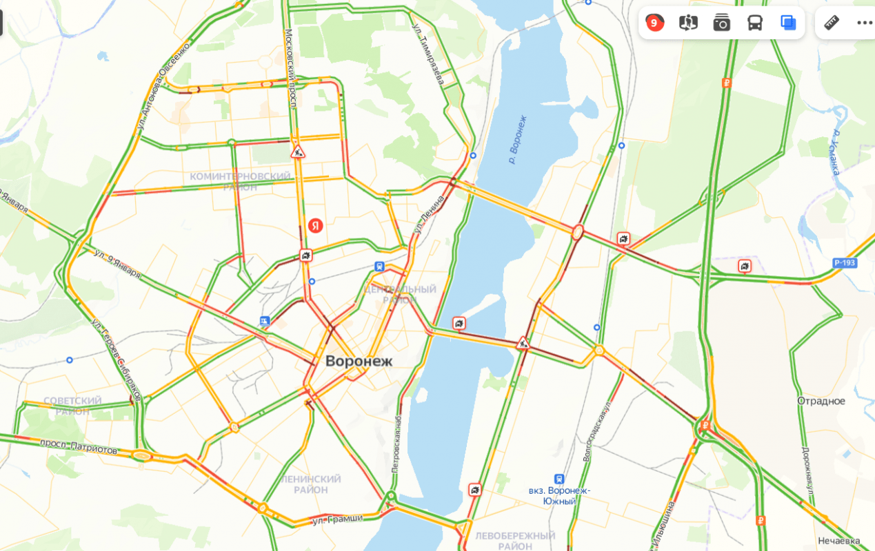 Дороги Воронежа вечером в среду, 20 апреля, сковали 9-балльные пробки. Об этом говорят данные сервиса «Яндекс. Карты».