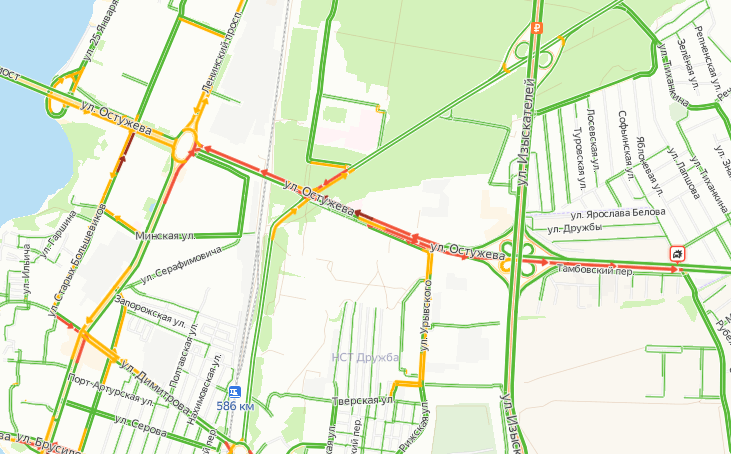 На «Яндекс. Картах» красным отмечен участок примерно в 4 км, растянувшийся от микрорайона Ветряк до областной больницы № 1 на Московском проспекте, 151, к.1. Проехать по отрезку можно со скоростью не более 7 км/ час.