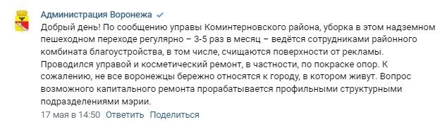Как оказалось, внешний вид этого перехода давно волновал воронежца. Он направил вопрос в городскую администрацию — ожидается ли благоустройство данного объекта.