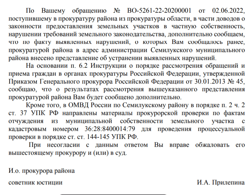 А семилукские власти тем временем перекладывают ответственность на администрацию Девицкого сельского поселения. От последней требуют провести проверку и определить сумму, на которую был нанесён ущерб противоправной вырубкой.