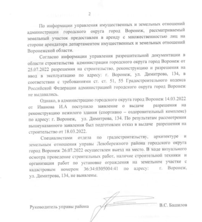 Горожане уже обращались в управу Левобережного района — в конце июля, ещё до того, как работы по монтажу забора начались. В управе ответили, что разрешения на любое строительство на данном участке не выдавалось, представители управы даже выезжали на место, но никаких признаков установки незаконного ограждения обнаружено не было.
