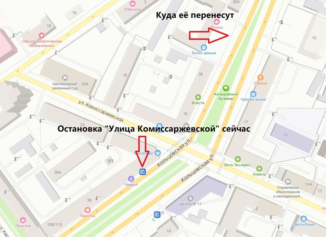 Так, остановку перенесут от дома № 38 на улице Кольцовской к дому № 34 на той же улице.