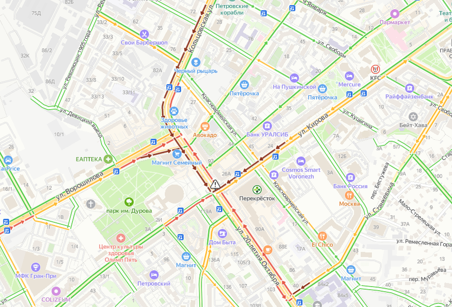 Первый перекрёсток — пересечение Ворошилова, Кольцовской и 20-летия Октября. На первой улице пробка начинается от храма перед парком им. Дурова, на второй — от Луча, на третьей — от второго перекрёстка.