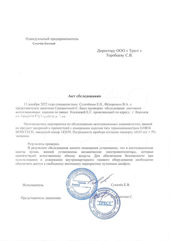 — Дома была жена — по этому вопросу созванивались со мной. В телефонном разговоре было сказано, что всё в норме, но акт при моей жене составлять не будут — так у них не принято. На этой «проверке» присутствовала мастер «Треста» — Соломатина С. Через день она прислала фото акта проверки, в котором уже чудесным образом обнаружились нарушения, а именно: наличие вентиляторов в ванной и туалете! Также было подробно расписано, каким прибором производился замер тяги и прочего. Вот только он вообще не доставался сотрудниками. К счастью, в акте не стали фантазировать и просто не указали никаких параметров, — рассказывает мужчина.
