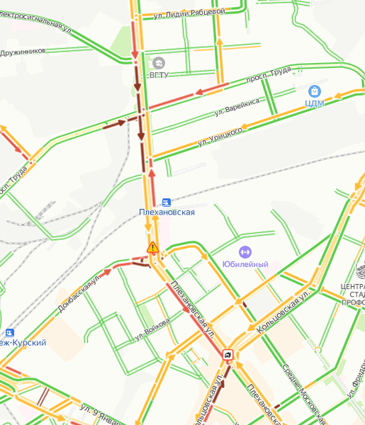 Заторы начинаются у пересечения Московского проспекта с улицей Лидии Рябцевой и заканчиваются у пересечения Плехановской и Кольцовской, затрагивая прилегающие улицы.