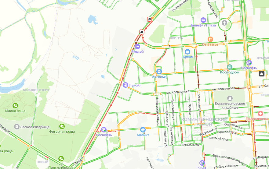 Причиной заторов обозначены две аварии: одна произошла неподалёку от указанной остановки, а другая — на въезде на окружную с бульвара Победы.