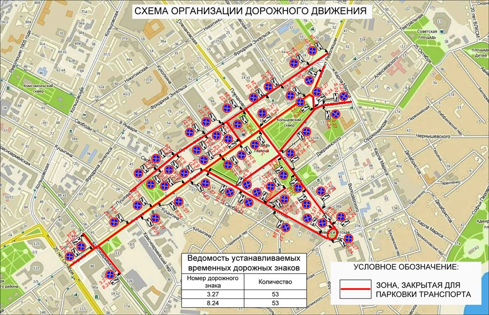 Также полностью запретят парковаться на площади Ленина, улице Кардашова, в Театральном проезде, на Университетской площади и в проезде между улицей Платонова и домом № 36 на улице Орджоникидзе.