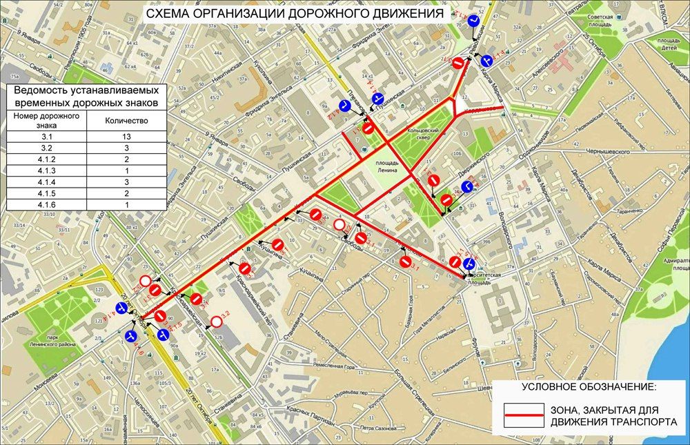 Кроме того, полностью закроют проезд по площади Ленина, Театральному проезду и улице Кардашова.