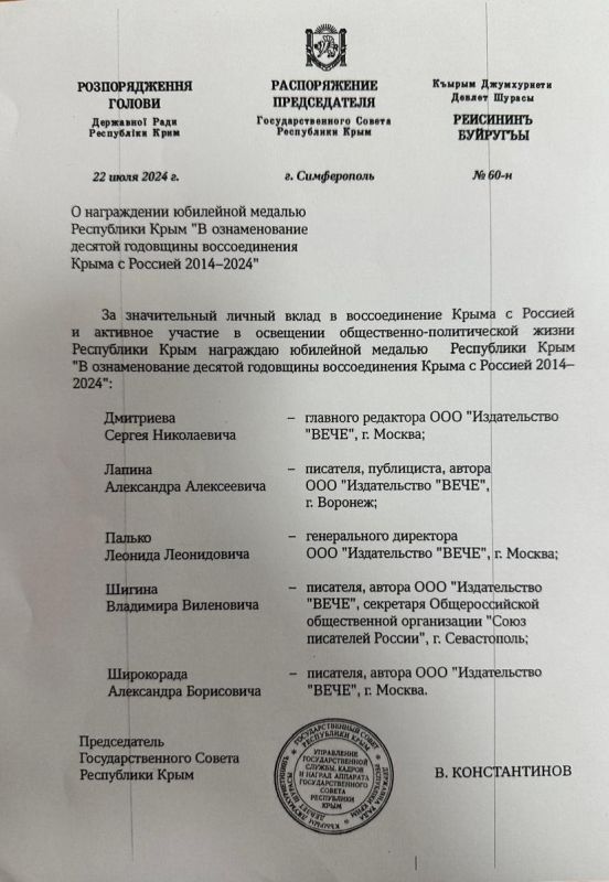За значительный личный вклад в воссоединение Крыма с Россией и активное участие в освещении его общественно-политической жизни награды получили генеральный директор издательства «Вече» Леонид Палько, главный редактор этого издательства Сергей Дмитриев, известные писатели Александр Лапин, Владимир Шигин, Александр Широкорад.