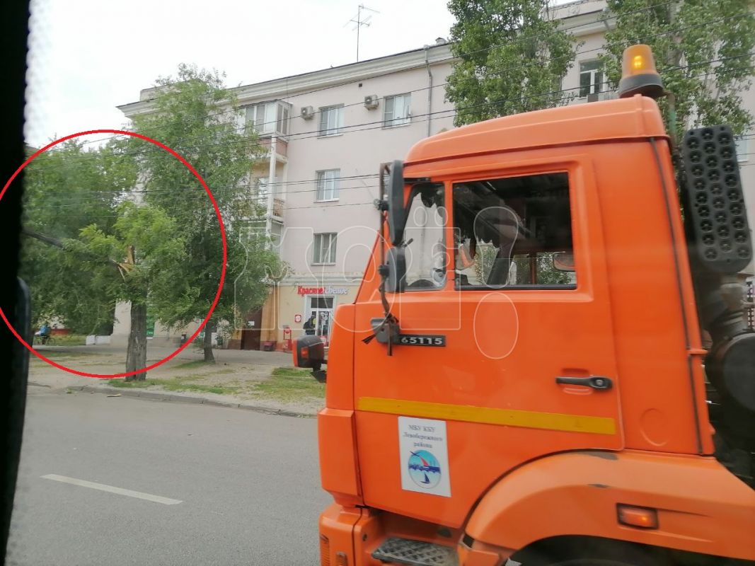 Другой народный корреспондент рассказал, что около остановки «Институт Гипрокаучук» при движении в сторону ДК Кирова ветка обломилась прямо у дороги. Судя по стоящей рядом машине коммунальщиков, её уже убрали.