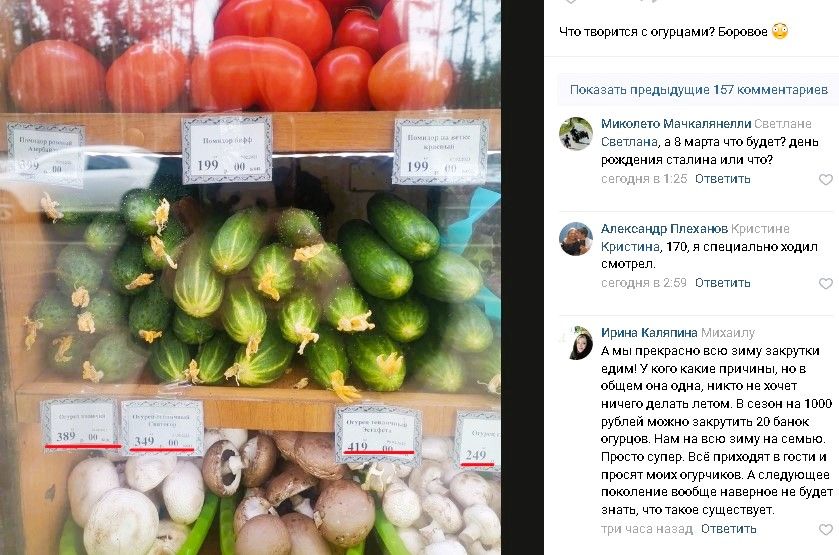 В комментариях к посту любителям киосков посоветовали зайти в сетевые магазины и купить огурцы по 120 — 180 рублей за килограмм. Но тут же появились горожане, заметившие, что в супермаркетах зелёный овощ тоже подорожал — до 250 рублей за кг.
