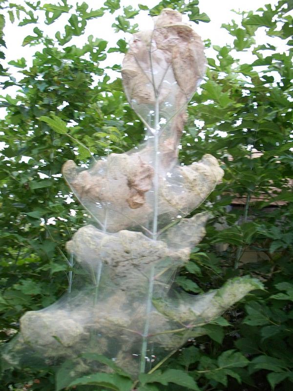 Какая-то гадость. На даче тянешься за сорняком и задеваешь рукой мерзкую липкую паутину, внутри которой висят какие-то куколки. Ещё неделю назад, накануне Дня России, такого не было. Но за пять дней нашего отсутствия на дачном участке деревья, кустарники и даже траву стал затягивать плотный слой паутины. Похоже, бедствие ещё впереди, ведь то, что там внутри находится в закукленном состоянии, скоро вылезет наружу.