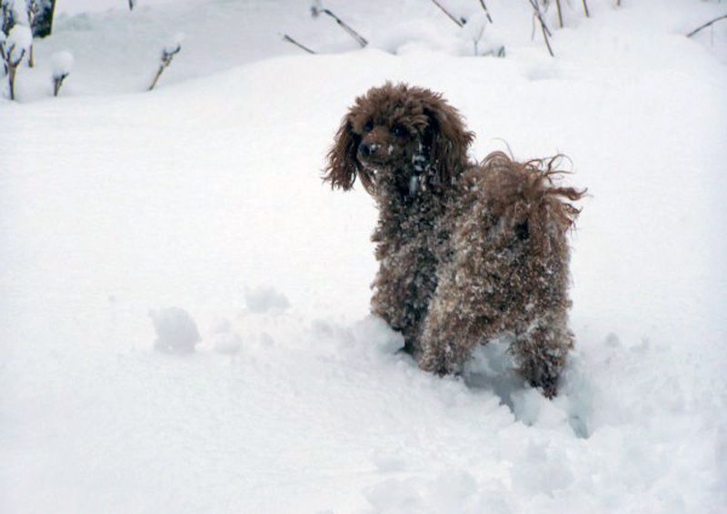 Подтаявший на солнце снег образует глянцевую корку (наст), что тоже ухудшает доступ воздуха к корням растений. Плотную снежную корку желательно разбивать не только в зоне цветников, но и в приствольных кругах деревьев и кустарников. Для этого иногда бывает достаточно устроить в саду игры с домашними животными. У меня, например, пуделина с удовольствием ныряет в снег за снежками. В результате её лапки оставляют множество следов-ямочек в плотной корке.