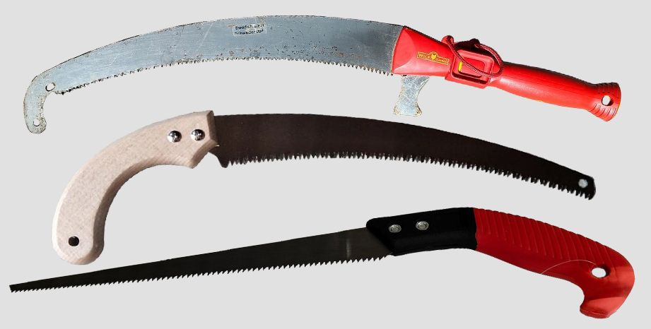 Конечно, для этой цели подойдёт и обычная ручная пила. Я, например, опиливая сучья диаметром больше 10 см на липах, клёнах, использую простую, хорошо разведённую ножовку для влажной древесины с длиной полотна 35 — 40 см. Короткий инструмент удобен для работы на высоте, на дереве или с лестницы. Но если работаю с земли или со стремянки, а сучья расположены довольно высоко, то в ход идёт специальная садовая ножовка. Изогнутая форма её полотна помогает быстро отпиливать довольно толстые сучья.