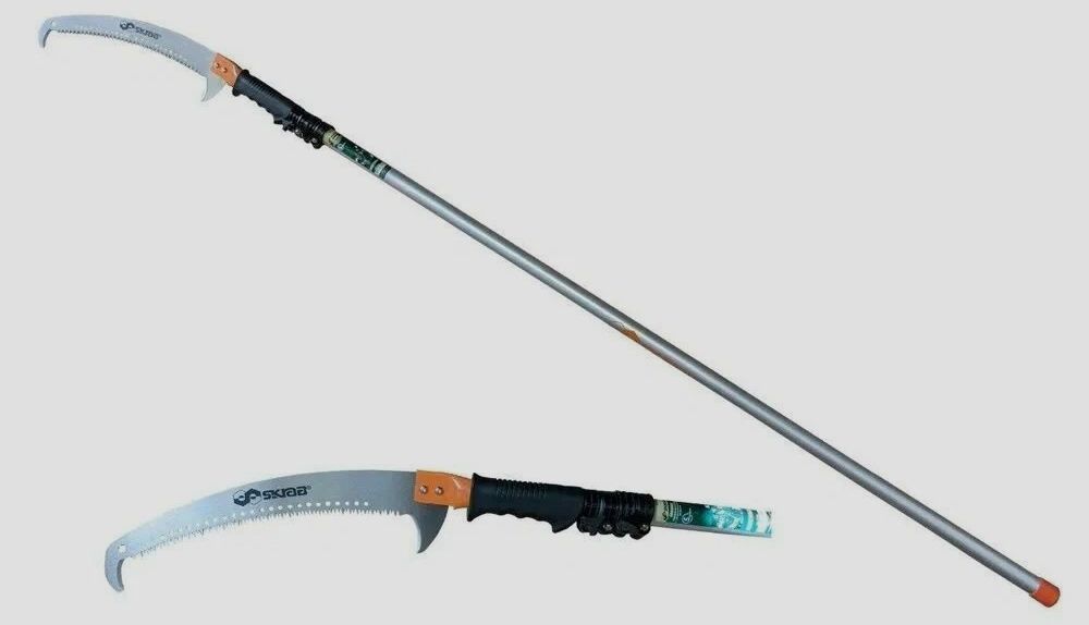 Подцепить отпиленную и застрявшую ветку удобно крючком, расположенным на конце полотна. Работая на старых деревьях, также использую ножовку на длинной ручке, если приходится доставать ветки, растущие выше или вдали от основного ствола. Громоздкий инструмент поднимаю наверх, уже забравшись на ствол, с помощью верёвки.