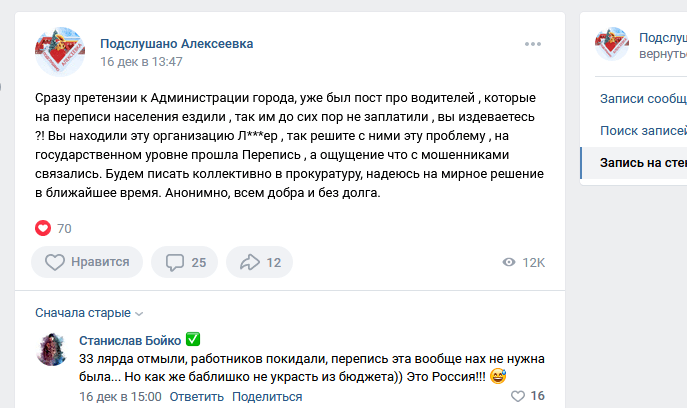 По словам читателя, водителям выдали часть зарплат, после чего сотрудники «Лидера» стали обещать, что выплатят долг, но этого так и не произошло. 25 ноября, после окончания переписи, в «Лидере» перестали реагировать на звонки, сообщения и электронные письма. В Воронеже их действия координировал местный логист-диспетчер, который с октября неоднократно пытался выяснить, почему прекратились выплаты денег. Из-за этого часть водителей прекратила работать на переписи.