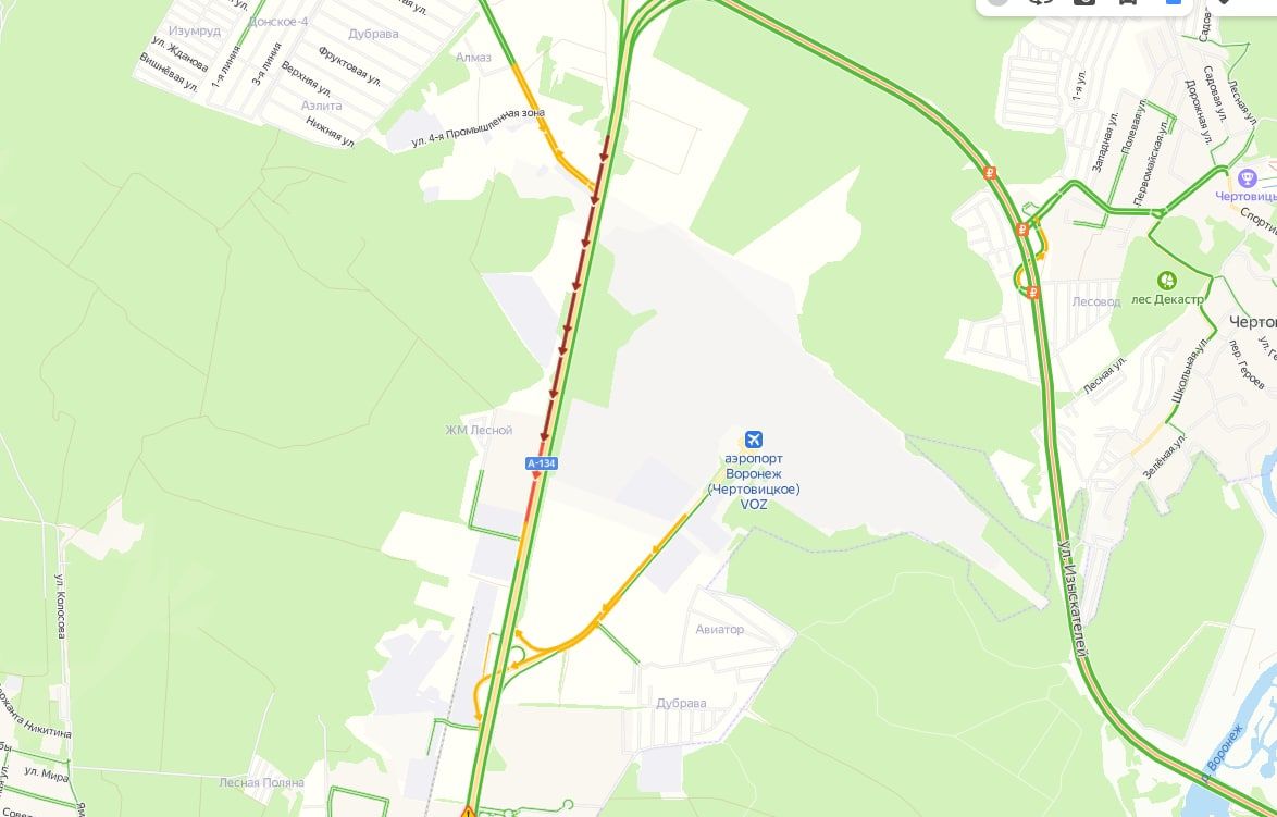 На сайте «Яндекс. Пробки» показано, что большая часть трассы А-134 выделена красным цветом.